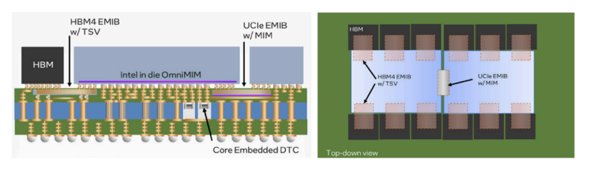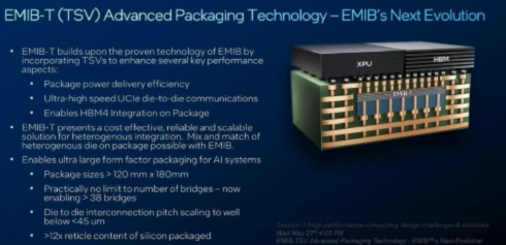 英特尔还在持续扩展EMIB组合,EMIB-M集成MIM电容增强电源传输能力,EMIB-T加入硅通孔(TSV)支持HBM4集成,信号传输速度达32Gb/s。