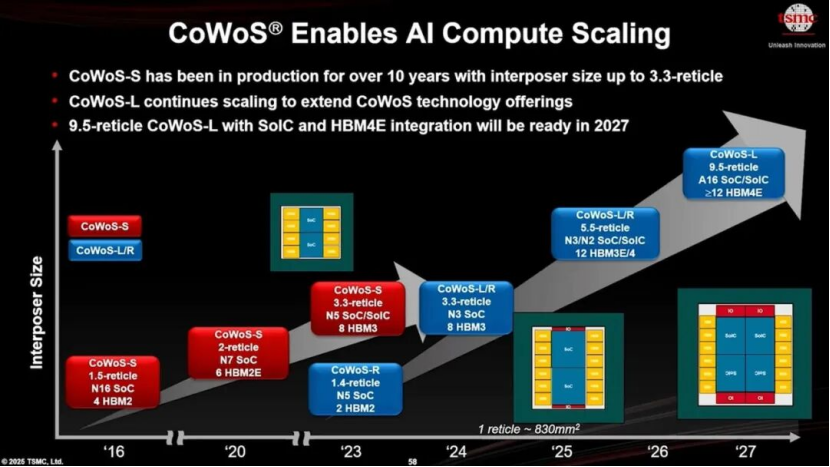 在技术迭代上,台积电推出CoWoS-S/R/L三个版本,最新的CoWoS-S5技术已将中介层面积拓展至2400mm²,支持8颗HBM3内存与2颗SoC芯片集成,内存带宽高达5.3TB/s。