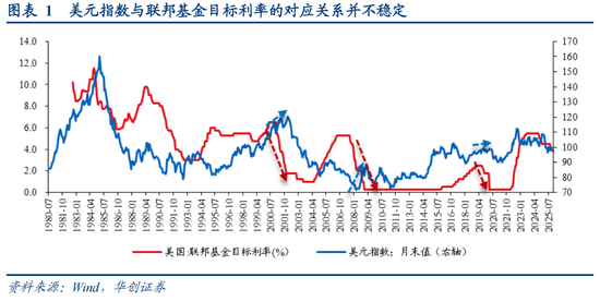 从美元指数与美联储政策利率走势来看,二者的对应关系并不稳定。联邦基金目标利率下行、但美元指数却上行的情形并不罕见(图1)。