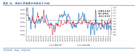 原因在于,人民币作为金融账户尚属有限开放的币种、制造业大国的货币,经常账户属性十分关键(净结汇大部分时间由经常账户主导,图24),而从流量视角看,当期经常账户净结汇=贸易顺差×净结汇率,意味着净结汇的潜力取决于贸易顺差,贸易顺差核心在于出口竞争力;净结汇的趋势则或取决于企业持汇意愿,反映为净结汇率(图25),企业持汇意愿波动会受到息差、近期汇率波动的影响,但趋势方向则取决于PMI(图26)。