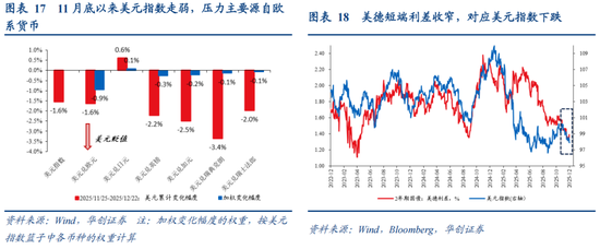③外盘响应方面,11月底以来美元指数震荡回落。其贬值压力主要源于欧系货币(图17),背后则是美联储降息预期升温下,美德短端息差的收窄(图18)。