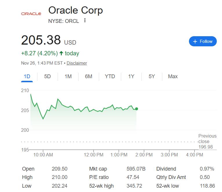 过去一个月暴跌近30%的甲骨文股价周三大幅反弹,盘初曾涨6.6%,午盘涨幅收窄到5%以内,仍势将脱离周二创下的五个多月来收盘最低谷,且有望创下10月13日以来最佳单日表现。